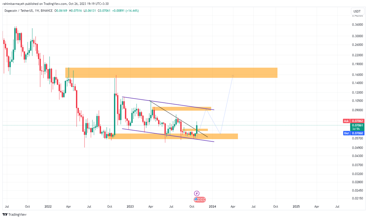 همانطور که در تایم فریم هفتگی مشاهده می کنید دوج کوین 2 تارگت دارد و فعلا تارگت صعودی هست