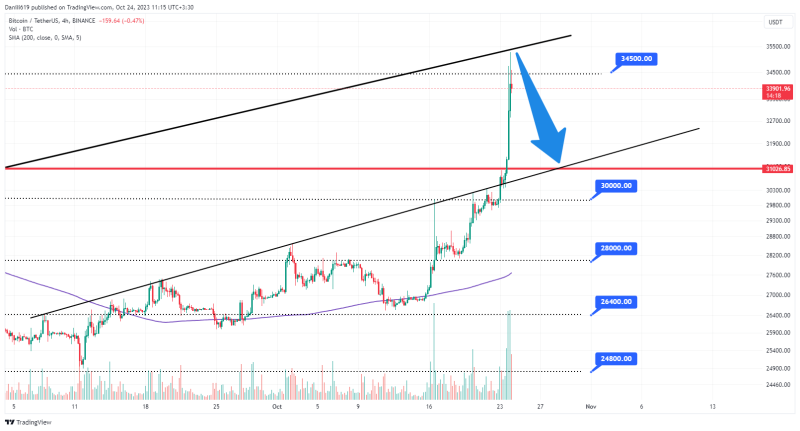 در حال حاضر قیمت بیت کوین در نمودار لگاریتمی یکروزه به ناحیه مقاومتی ۳۴,۵۰۰ دلار و خط روند قبلی خود واکنش نشان داده است. با نگاهی به نمودار ۴ساعته، انتظار یک پولبک تا سطح حمایتی ۳۱ هزار دلار را از بیت کوین داریم.