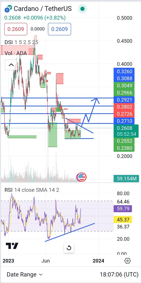 باتوجه صعود بیت کوین و رشد التکوین ها به واگرایی شدید نماد درتایم فریم دیلی همچنین ساختار کف سازی و کف دوقلو مشهود همچنین با توجه به الگوی پرایس اکشنی نماد در مثلث نوسان میکند وانتظار شکست از سقف الگو و وخط روند نزولی وتارگت های ترسیم .