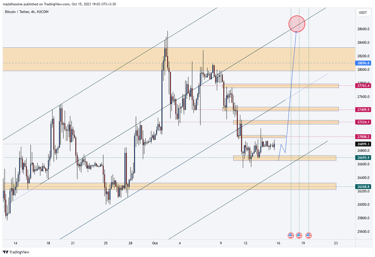 دیدگاه شخصی : قیمت بیت کوین در تایم فریم روزانه در محدوده حمایت 24459 متوقف و واکنش برگشتی داشته و داخل کانال صعودی قرارگرفته و پس از شکست در خط پایین کانال صعودی متوقف شده احتمال اول اگر قیمت درمحدوده پایینی کانال 26695 موقعیت خودش رو حفظ بکنه