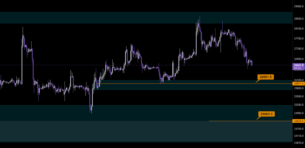 تحلیل بیت کوین تایم 4 ساعته و روزانه ، روند با احتمال بالا نزولی محدوده های مهم حمایتی بیت کوین 25977.0 و 24664.3 که در تصویر مشخص شده