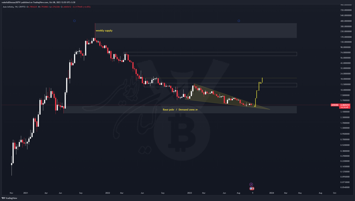 چراکه همه AXS رو با بولران های طولانیش به یاد میارن.. و این 100هفته ی نزولی گذشته رو فقط میشه یک اصلاح 50درصدی با فاصله زمانی طولانی در تایم ماهانه و هفتگی توصیف کرد !