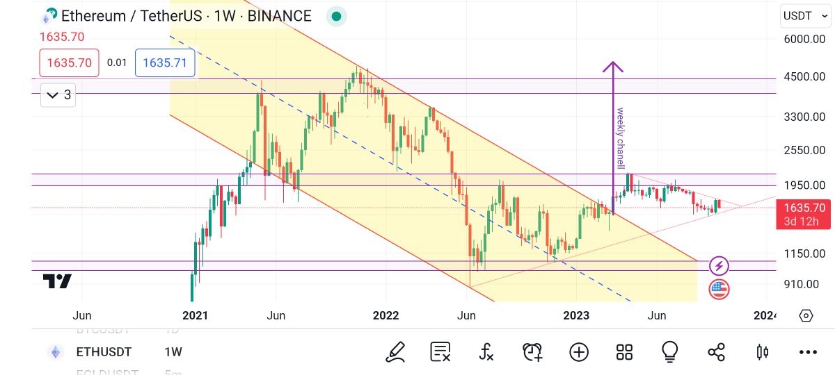 طبق تحلیل صورت گرفته در مارس ۲۰۲۳کانال نزولی درتایم هفتگی شکسته شده است.ودرحال حاضر درگیر مقاومت سنگین ۲۱۰۰دلارمیباشد.درصورت شکست این ناحیه انتظارصعودتاسقف تاریخی دورازدسترس نخواهد بود.