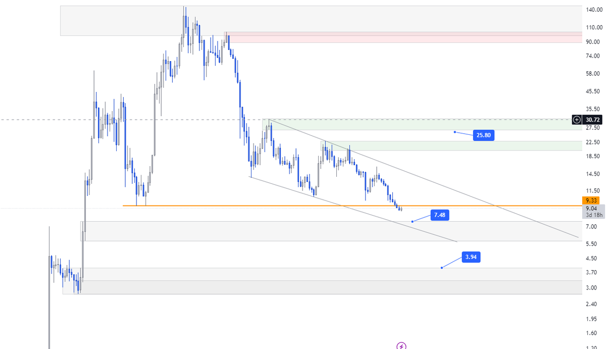 تحلیل ارز آواکس avax در تایم هفتگی … همانطور که مشخصه در تایم هفتگی در یک کانال نزولی قرار گرفته … اون خط نارنجی یک کف مهم بود که فعلا انگالف شده و سفارشاتش برداشته شده احتمالا روی این سطح نمیشه برای خرید حساب کرد و سطوح پایینتر که در تصویر مشخص شده نواحی بهتری هستند … نکته مهم : اگر قیمت از همین جا به سمت بالا حرکت کرد تا زمانی که خط روند نزولی شو به بالا نشکسته باشه همچنان روند نزولیه و میتونه دوباره یک کف جدیدتر بزنه …