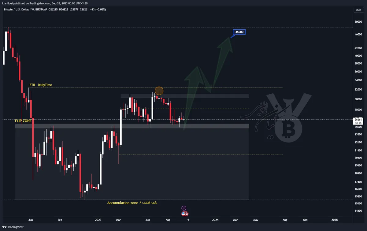 خووب دقت کنید که بیتکوین در کادر مستطیل خاکستری در تایم هفتگی و در بین ناحیه 25 الی 15هزاردلار یک accumulation و انباشت بزرگ رو انجام داده و همونطور که می بینید با خروج از این انباشت ما شاهد flipzone و تستهای FTB و 2TB به ناحیه فلیپ زون هفتگیمون توی 25000تا هستیم..