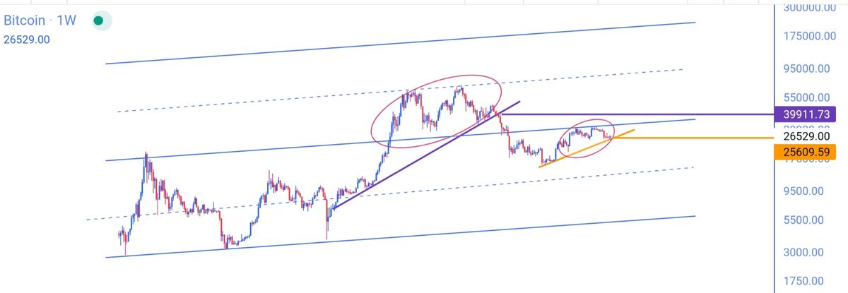 وقت بخیر. شکست خط روند داینامیک و تشکیل کندل تثبیت درتایم هفتگی زیر آن به ما بیت ۲۱ رو هشدار میده. تایم هفتگی یکی دوکندل روی خط داینامیک محتمل هست. درواقع ممکنه بازار ۲۶ تا ۲۸ به مدت دوهفته رنج بزنه.ممنون از وقتی که گذاشتید🙏