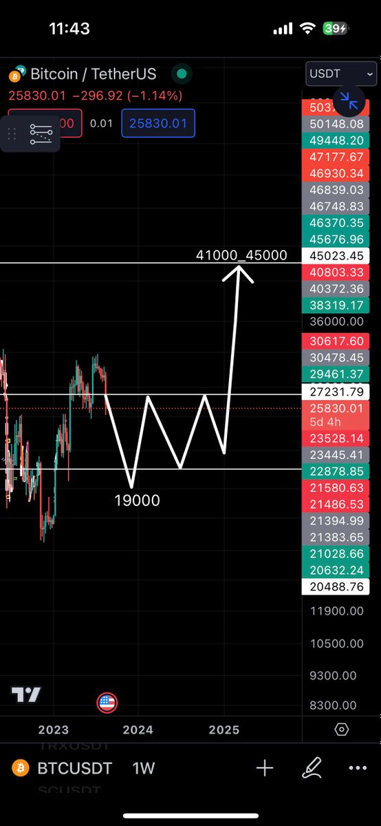 بیت تا اوردبلاکی که در تایم ماهانه داره که تقریبا ۱۹۰۰۰ هزار دلار هست پایین میاد و سپس تو یک رنج تا ۲۷/۲۸ هزار قرار میگیره و سپس هدف ۴۵هزار هستش