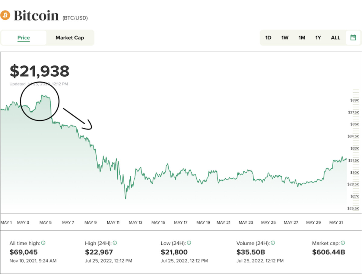 قیمت بیت کوین بلافاصله پس از جلسهی فدرال رزرو در 3 و 4 می افزایش یافت اما پس از آن در 6 می دچار افت قابلتوجهی شد و درصد زیادی از ارزش خود را از دست داد. در آن زمان فدرال رزرو تصمیم بر افزایش 0.5 درصدی نرخ بهره و کاهش 9 تریلیون دلار ترازنامهی بانک مرکزی گرفت