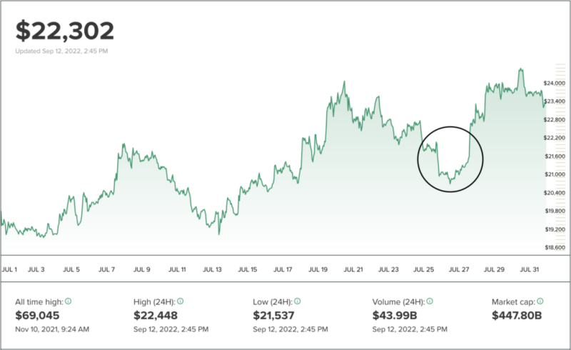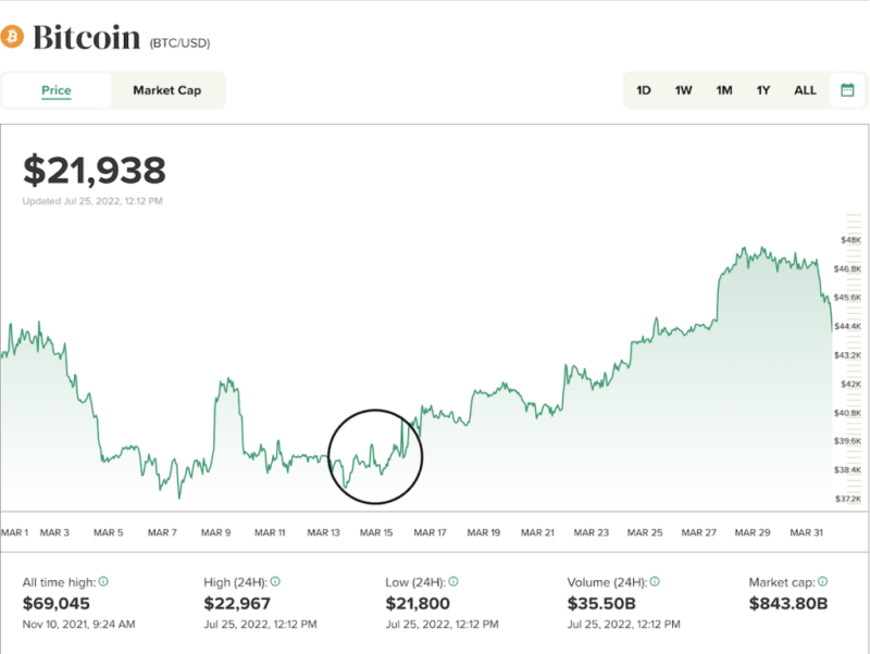 بیت کوین در 13 مارس 2022 برای مدت کوتاهی دچار افت قیمت شد. در آن زمان فدرال رزرو تصمیم به افزایش 0.25 درصدی نرخ بهره گرفت که این میزان اولین افزایش از سال 2018 بود