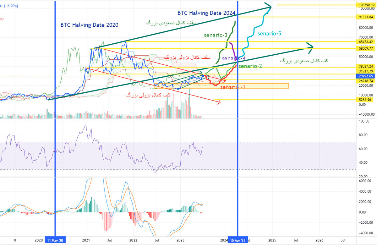 سناریو 5- ادامه سناریو های قبلی هست و از کف کانال صعودی بزرگ در زمان هاوینگ (44000) میره به سمت سقف کانال صعودی بزرگ (100000 دلار)
