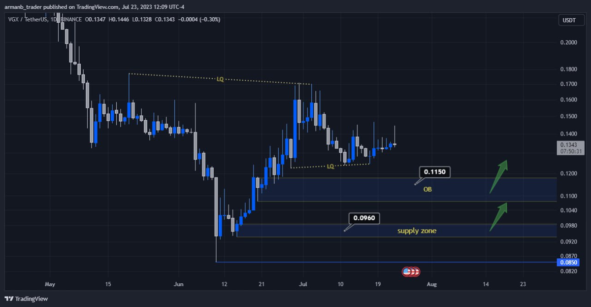 قیمت بعد از روند صعودی مناسبی که داشته محدوده های حمایتی مناسبی ایجاد کرده و قبل از حمایت 0.115 دلار نقدینگی وجود داره و میتونیم شاهد جمع شدن این نقدینگی توسط قیمت باشیم و در دو محدوده حمایتی مشخص شده در چارت ، و در صورت دیدن تریگر در تایم پایین تر میتونیم شاهد شروع روند صعودی باشیم ، حتما زیر نظر داشته باشید