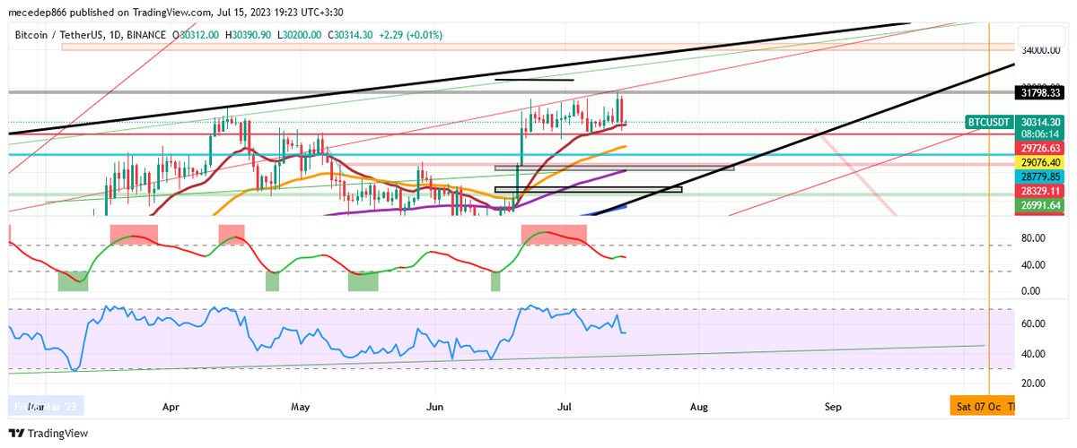 حالا بریم سر تحلیل میدونم خیلی شلوغه ولی با یه نگاه متوجه میشیم که واگرایی هم تو هفتگی هم تو روزانه داریم که فقط زمانی این واگرایی تو هفتگی fail میشه که اندیکاتور با قیمت حرکت صعودی قدرتمندی داشته باشه بالای 32 هزار . در روزانه که در صورت ریزش به ترتیب 28981 بعد 28141 و 27000 تا خط روند که در صورت شکست ریزش....