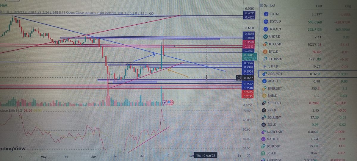 دوستان ببینید ۲ روزه بازار با خبر ریپل یه شوک خورد و داستان و پیچیده کرد هر چند باعث یه سری اتفاقای مثبت برا آدا تا این جای کار بوده تو چارتی که گذاشتم فلش آبی خط ترند نزولی و از ۴۵ سنت رو نشون میده نکته مثبت این بود که رفتیم بالای اون خط تا الان که دارم این تحلیلو میزارم هنوز خوبه اگه ۰.۳۲۶۰ تو هفتگی و روزانه از دست بره خوب نیس اون خط قرمز که با فلش زرد یا