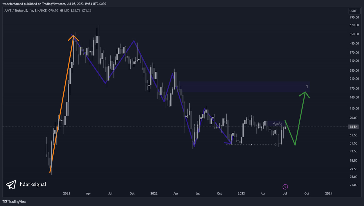 همان طور که با خط چین مشخص کردم، قیمت موفق به بستن کند در زیر کف قبلی یعنی 50.4 نشده است و اینطور می توان استنباط کرد در صورت شکست ناحیه کلیدی(در شکل مشخص شده) قیمت به راحتی تا ناحیه 1 یعنی قیمت 155 دلار رشد کند.