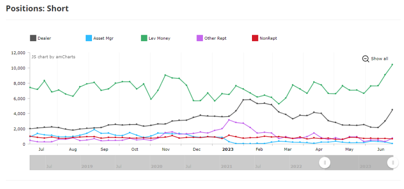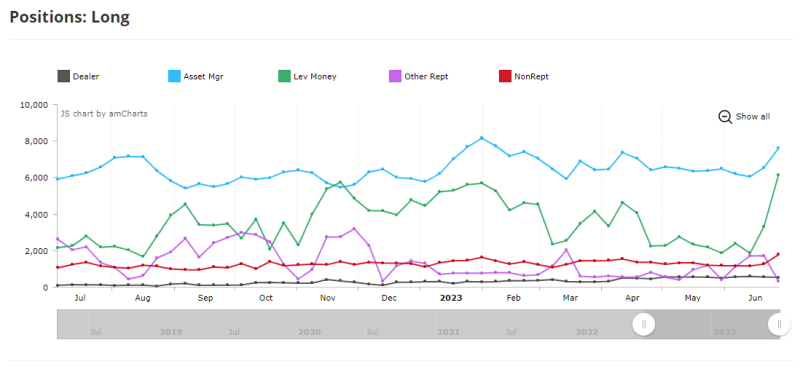 با نگاه به آخرین COT Report بیت کوین که مربوط به 27 ام ژوئن میباشد میبینیم Asset Manager ها در طول این شش ماه در حال خرید بودند و تا تاریخ ذکر شده 7603 پوزیشن خرید داشتند که تقریبا در سقف 6 ماه قبل هست
