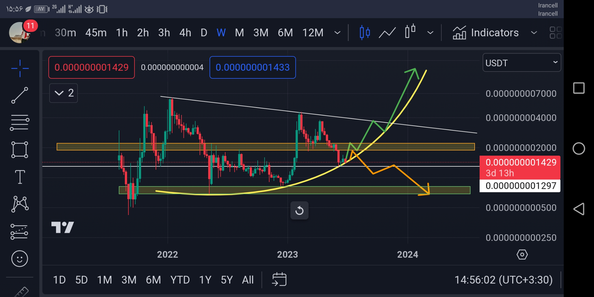 سناریو صعودی(خط سبز) احتمالش قوی تره چرا که در قیمت 14e حمایت خوبی شاهد بودیم.