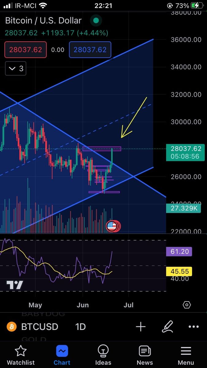 سلام بیت کوین تونست از کانال نزولی بلند مدتش خارج بشه اگر بتونه مقاومت مشخص شده با فلش زردو بشکنه و بهش پولبک بزنه میتونیم بگیم بیت وارد روند صعودی شده