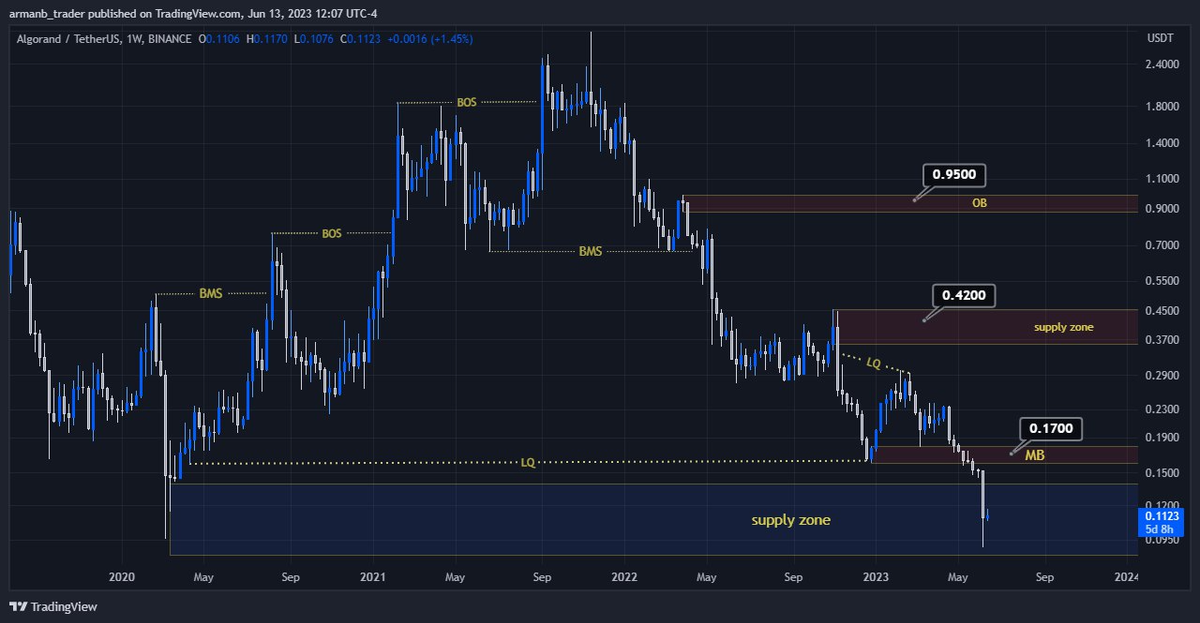 قیمت به محدوده حمایتی مهم سطح 0.11 دلار رسیده و میتونیم انتظار رشد قیمت از این حمایت داشته باشیم. برای ورود امن باید منتظر باشیم تا قیمت سطح مقاومتی 0.17 دلار را بشکند و در برگشت قیمت به محدوده های حمایتی ایجاد شده میتونیم خرید بزنیم.