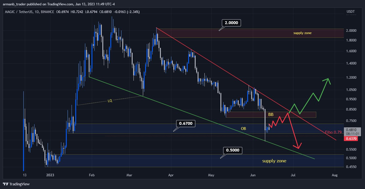 قیمت خیلی فشرده در حال اصلاح نزولی میباشد و همچنان در محدوده حمایتی 0.67 دلار قرار دارد و به کف روند نزولی خودش واکنش نشان داده ، انتظار میره قیمت کمی اصلاح صعودی داشته باشه و در محدوده مقاومتی 0.83 دلار ، که ناحیه مهم تصمیم گیری هستش ، باید منتظر باشیم که به از شکست خط روند نزولی در پولبک وارد شویم. و درصورتی که در کندل های قیمت نزدیک این مقاومت ضعیف وجود داشته ، وارد پوزیشن Sell و از ریزش قیمت استفاده کنیم.