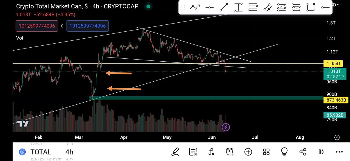 نمودار شاخص توتال گپ قیمتی در دو محدوده وجود داره که که احتمال پرکردن شون زیاده داخل چارت با فلش مشخص کردم انچه که مشخصه روند صعودی توتال شکسته شده و ریزش کل بازار محتمله محدوده ۸۷۳ منطقه حمایتی هست