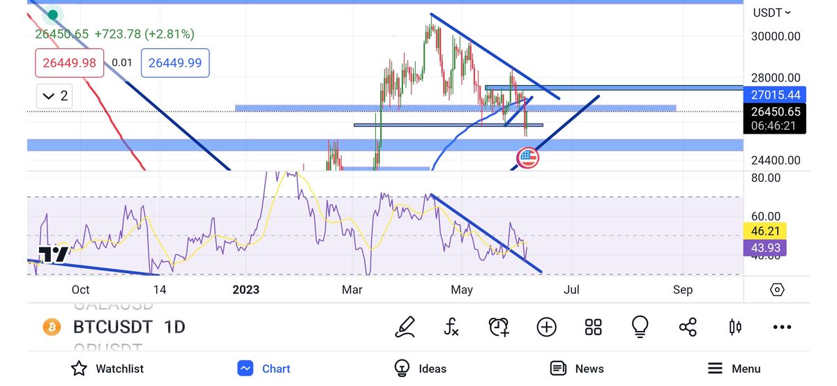 سلام خسته نباشید، بیت کوین توی تایم روزانه درگیر خط روند نزولی هستش که در اندیکاتور (آر اس آی) خط روند رو شکسته و پولبک هم زده و داریم میریم برای هدف محدوده های ۳۰۰۰۰ الی ۳۲۰۰۰۰