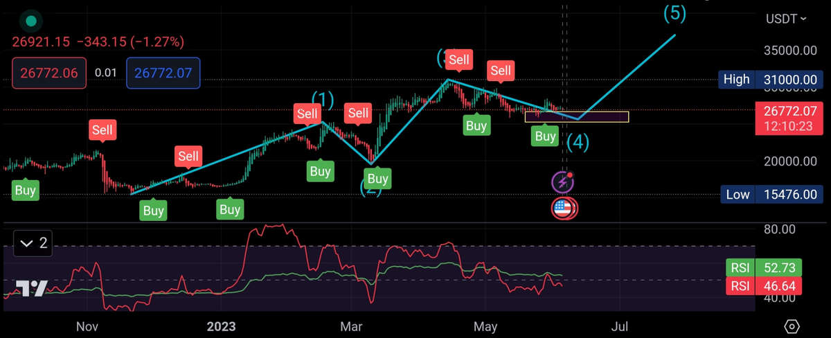 چیزی که چارت نشون میده در تایم فریم روزانه و طبق موج شماری الیوت از بازه قیمتی (25200-26600) داخل باکس میتونیم انتظار شروع بول ران موج پنج باشیم.