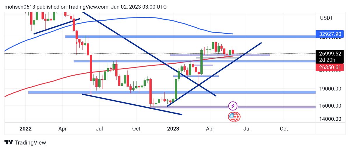 سلام خسته نباشید، همونطور که توی چارت مشخصه، بیت کوین توی تایم هفتگی بعداز شکست خط روند نزولی و ایجاد سقف و کف بالاتر تونسته به مویینگ ۲۰۰ (خط قرمز) پولبک بزنه و یه کندل سبز قابل قبول ببنده، هدف اول ۳۲۵۰۰-۳۳۰۰۰ میتونه باشه که محدوده مووینگ ۱۰۰ (خط آبی) میتونه باشه. باتشکر، موفق باشید