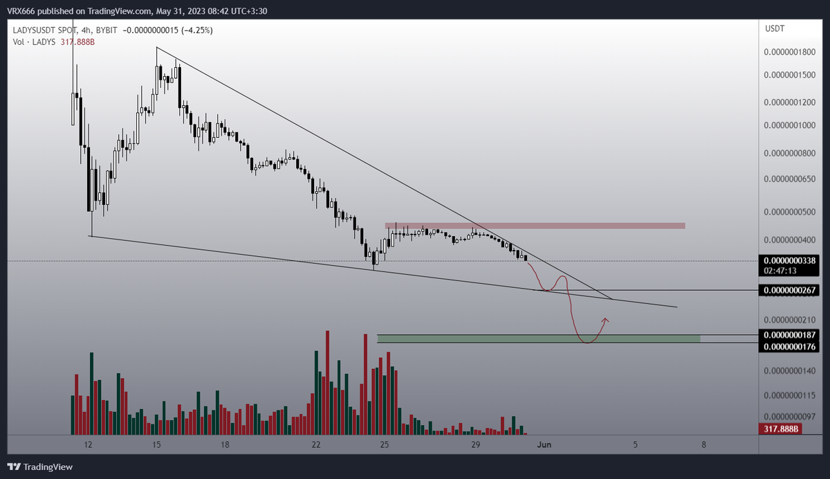 خب دوستان LADYS در تایم فریم 4 ساعته یک مقاومت حدود 43/45 داشت که نتونست بشکنه اونو و یک خط روند هم از سقف داره که هربار بهش برخورد میکنه کندل ها قیمت به سمت پایین حرکت میکنه حالا نکته اینجاس که روی 267 یک حمایت داره و دقیقا خط روند پایینی کفش همونجاس ممکنه یه برگشت ریز در حد 10 درصد داشته باشه ازونجا و در نهایت این مثلث بزرگو در برخورد چهارم به کفش بشکنه و تا گپ قیمتی 176تا 187 ریزش داشته باشه ازونجا باز میتونه رشد خوبی رو تجربه کنه