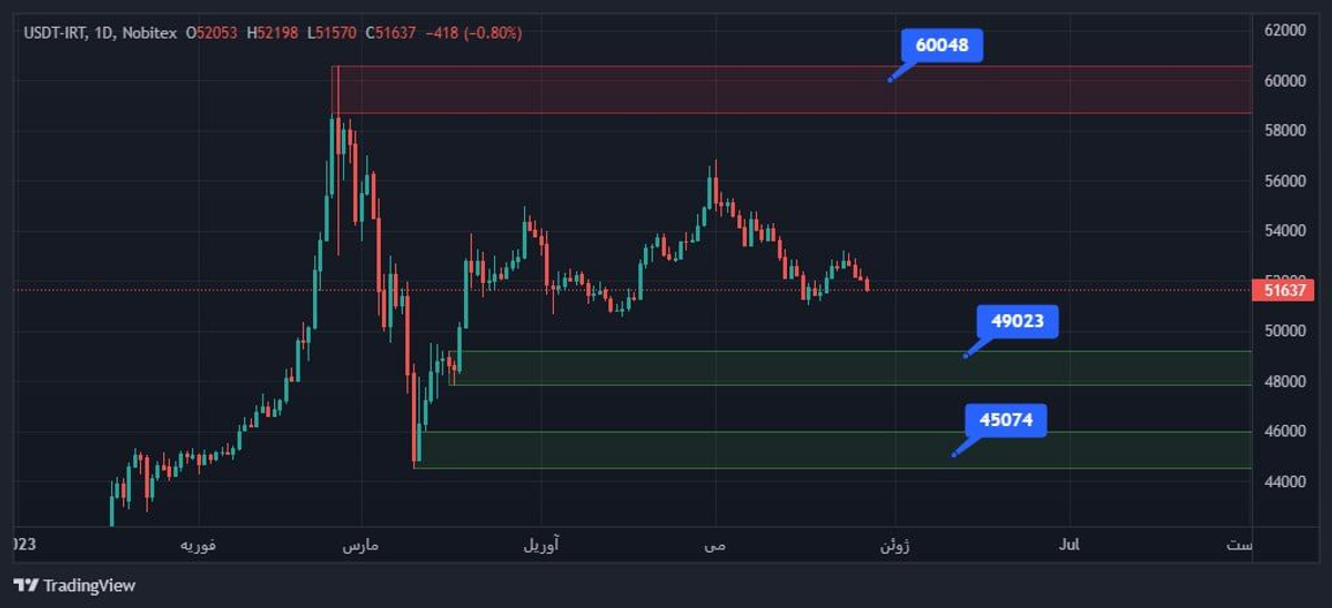 قیمت دو محدوده حمایتی بسیار مناسب در سطوح 49 و 45 هزار دارد که در صورت رسیدن قیمت به این نواحی ، میتوانیم انتظار رشد مجدد تا محدوده مقاومتی 60 هزار داشته باشم در میان مدت و بلند مدت