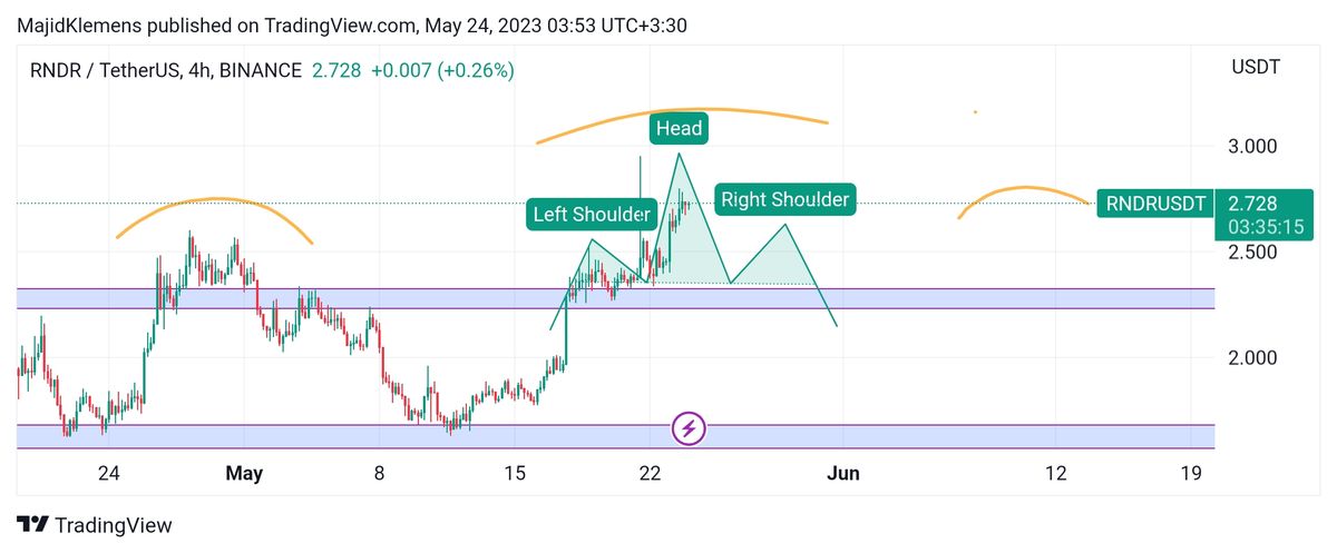 ریزش خوبی میتونه داشته باشه اگه الگو سر و شانه تشکیل بشه در تایم فریم چهار ساعته ارز خوب و آینده دار RNDR
