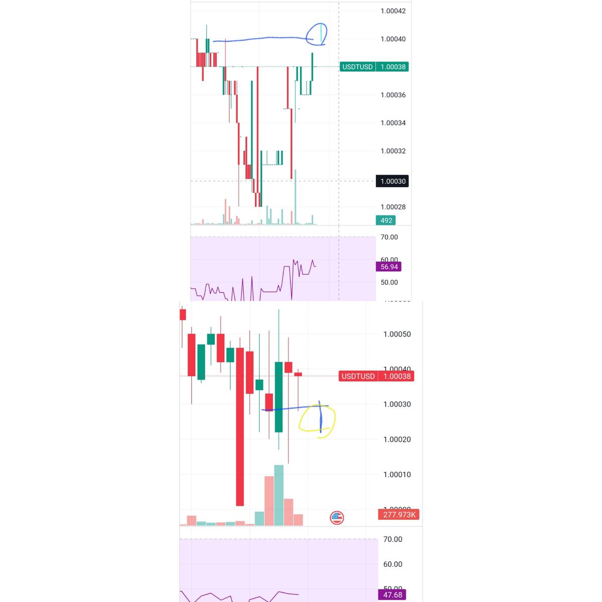 اگر یک کندل سبز دیگه بالای این کندل برسه به سطح اخرین سقف قیمت لحظه ای میتونیم انتظار صهودی بودن قیمت تتر رو داشته باشیم