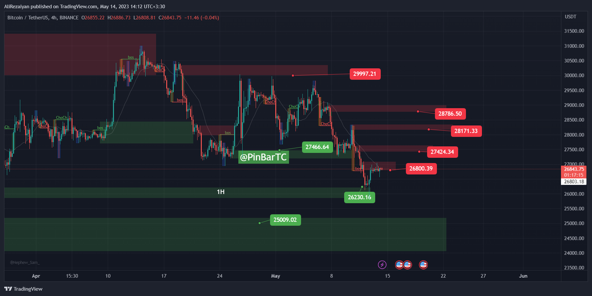 طبق تحلیل قبلی، بیتکوین دقیقا از نواحی مد نظر ریجکت شد، در حال حاضر هم در یک سقف مهم قرار گرفته که در صورت شکست این سقف و تثبیت بالای ناحیهی 27100، روند نزولی به روند صعودی تغییر میکنه و با گرفتن تاییدهی مناسب میشه به هدف سقفهای بالاتر تارگت گذاری لانگ رو انجام داد.