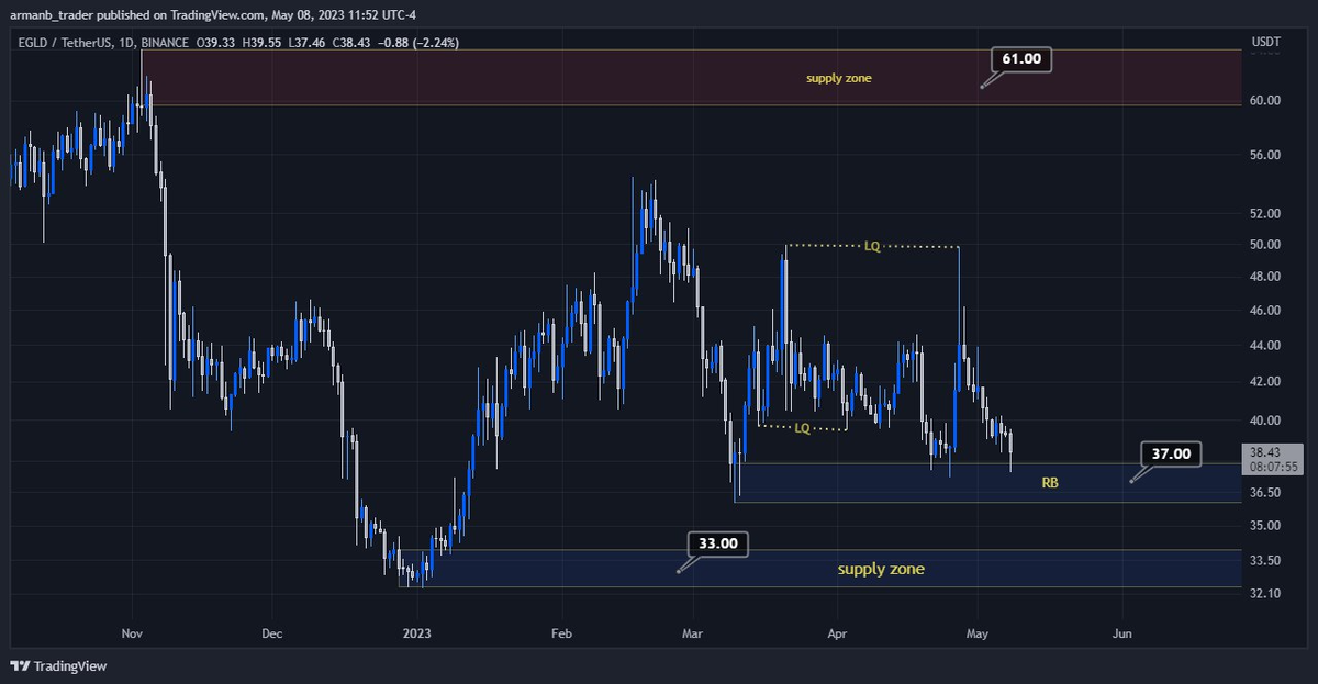 قیمت یکبار از محدوده حمایتی 37 دلار حدودا 30% رشد داشته ، و دوباره به این محدوده رسیده و در صورت مشاهده تریگر مناسبه برای گرفتن پوزیشن Buy ، در صورتی که این حمایت از دست برود. سطح 33 دلار ، میتواند جلوی ریزش قیمت را بگیرد و در صورت دیدن تریگر باعث شروع روند صعودی شود