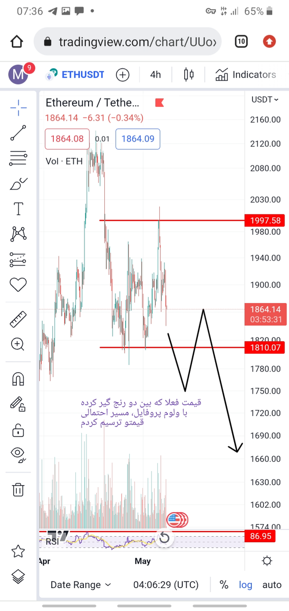 تو قیمت ۱۸۱۰ اتریوم به کف رنج این چند روزه برخورد میکنه. حالا چنانچه اینبار کف بصورت معتبر بشکنه اون مسیر قیمتی که ترسیم کردم به احتمال زیاد اتفاق میافته