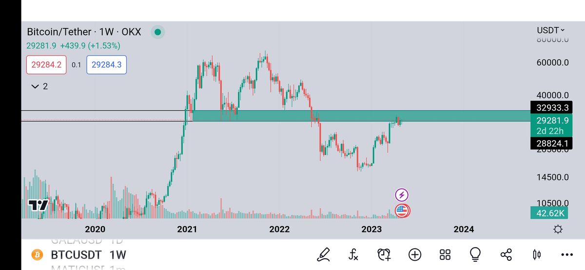 تحلیلی مشخصه اینه در چارت سقف دوقلو وپولبک به سطح شکسته محدوده سبز رنگ پس تا وقتی این محدوده رو پرقدرت نشکسته نمیشه گفت رفتیم برا بیت ۴۰هزار یا فلان سناریو اول ریزش هست نظر شخص خودم محدوده ۲۴۰۰۰هزار هست و بعد صعود