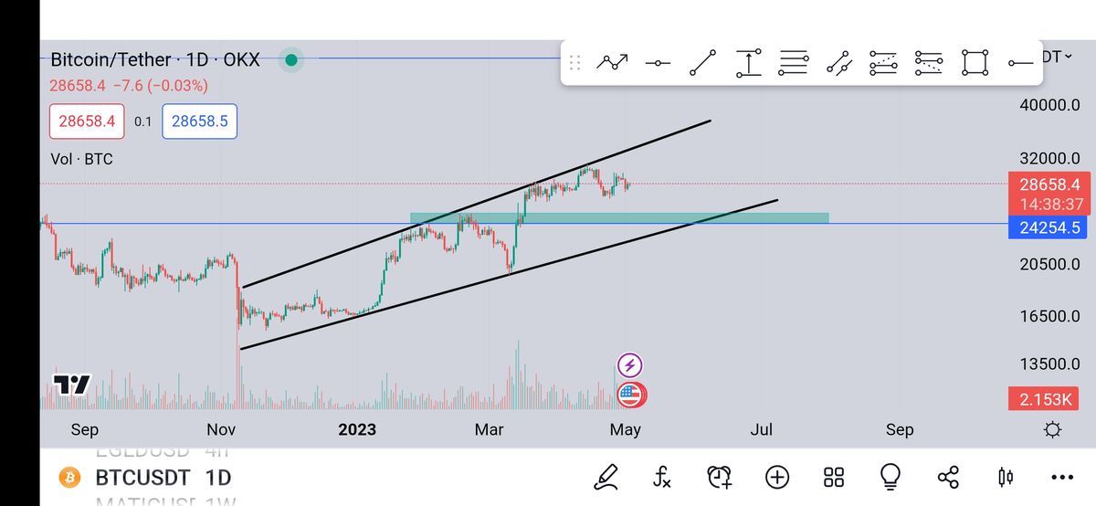ببینید دوستان تایم روزانه بیت کوین داخل این کانال درحال حرکته و بعد برخورد به سقف وارد اصلاح شده جای که منتظرم روند اصلاح تموم بشه محدوده سبز رنگ ۲۴۲۵۴هست و دوبار صعودی بشه فقط وقتی این سناریو باطل میشه که با ی کندل پرقدرت به پایین بشکنه از سقف کانال هم همین صورت فعلا وسط روند خرید نداره