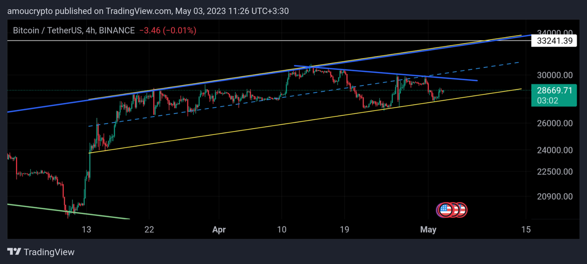 در تحلیلهای قبلی اشاره کرده بودیم که بیتکوین روند صعودی بلند مدت رو شکسته و برای باز پس گیری این روند به مشکل خورده و حدود ۴ ماه هست در نفوذ به این روند ناکام مانده ولی اخیرا در تلاش هست در یک کانال صعودی که سقف کانال همون مقاومت ذکر شده هست بتواند این مقاومت را بشکند. حفظ این کانال برای شکست مقاومت فوق ضروریه و اگه بیتکوین این کانال رو هم از دست بده شاهد افت سنگین قیمتی خواهیم بود( حداقل ۲۵۲۰۰)