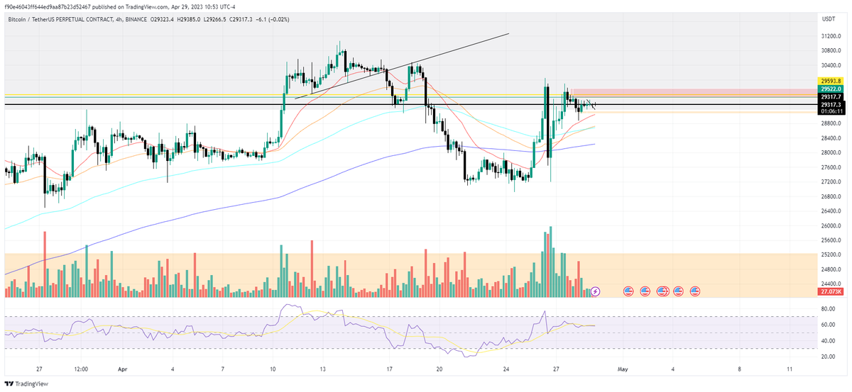 بیت در تایم 4 ساعته خط روند داینامیک رو برک کرده و بخوبی بهش پولبک زده و بعدش دو سقف پایین تر زده تک سناریو : بعد از هانت محدوده قرمز مشخص شده(29500تا29700) به سمت 25200 اصلاح میده