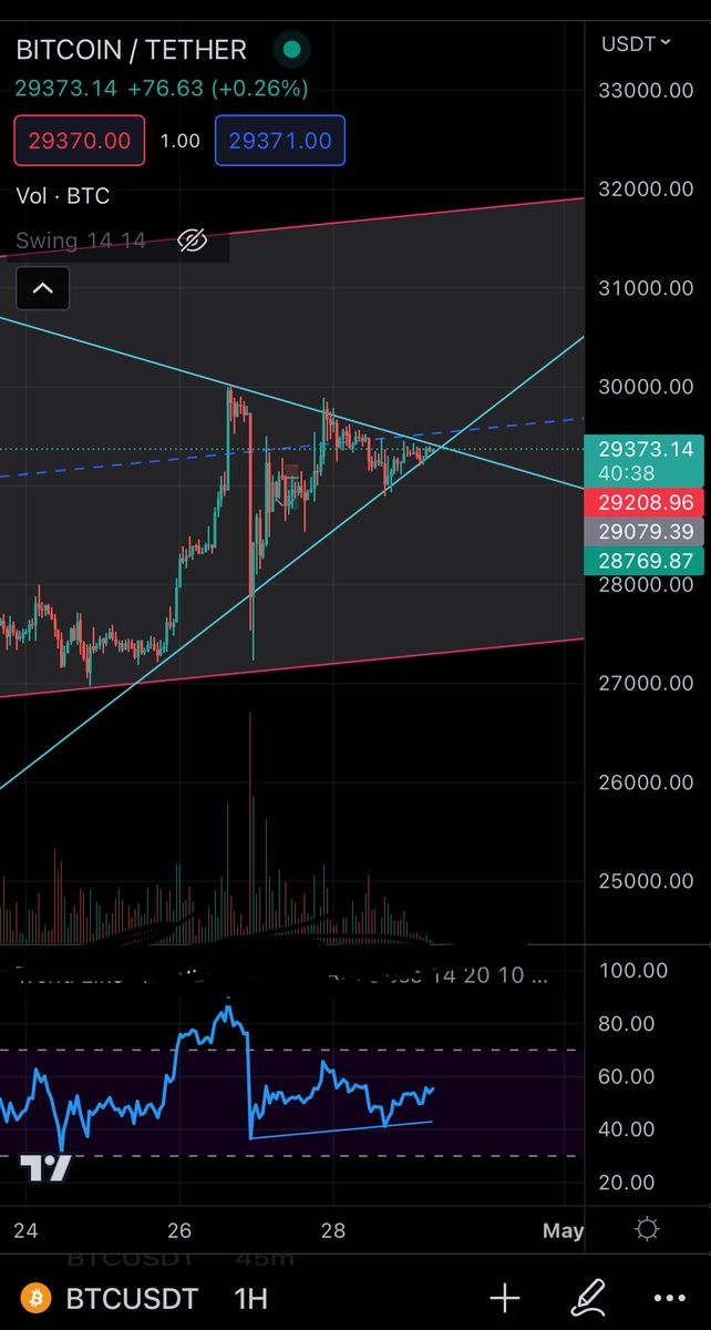 صبحهمهتریدرا عزیز بخیر باشه با توجه به حرکت کندل ها در تایم فریم یک ساعته مشاهده میکنید فشردگیدرون مثلث ایجاد شده و مبارزه بین خریدران و فروشندگان تنگاتنگتر شده بازار از هر سمتی که خط بشکنه به همون سمت حرکت میکنه درون سوپراندیکاتورار اس ای مشاهده میکنید که یک حمایت درونش میباشد و به احتمال زیاد قیمت بعد از برخورد با این حمایت رشد خواهد کرد پس امیدوار باشیم به رشد و شکستن قیمت۳۰ک بیت کوین و پایان دادن به این چند روز رنج زدن بازار البته با توجه به تعطیلی اخر هفته های بازار های جهانی امروز و فردا شاهد حرکت خاصی از بازار نباید باشیم روز همگی خوش پر سود باشین
