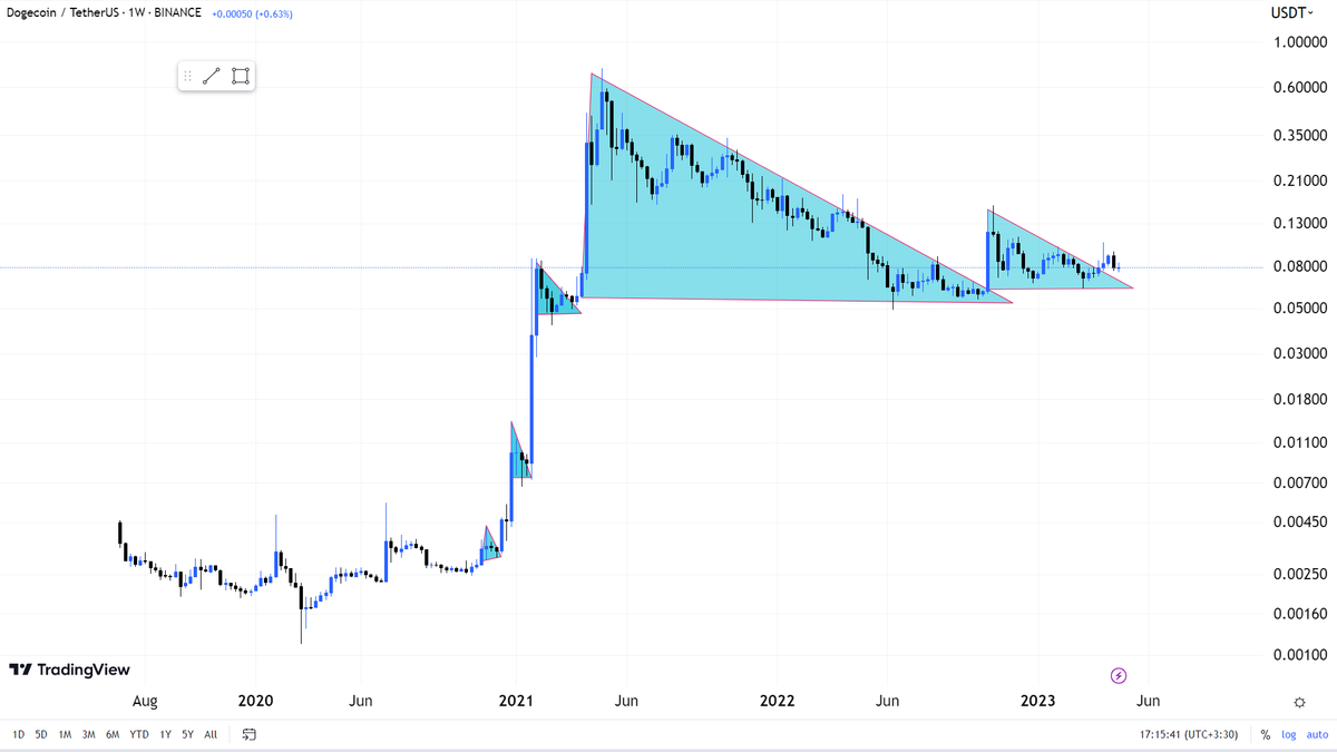 دوج کوین در تاریخ تکنیکالی خود همواره مثلث تشکیل داده و بعد رشد شارپی را تجربه کرده است،در حال حاضر مدتی هست از اون مثلث بزرگ خارج شده و پولبک به مثلث نیز خود در قالب یه مثلث کوچک دیگر نمود داشته و در تایم بالا مثلث پولبک هم به سمت بالا شکسته شده، اینکه از نظر زمانی دوج کی پرواز می کند چندانی اهمیتی ندارد بخصوص برای افرادی که بشکل مارتینگل روی این رمز ارز سرمایه گذاری می کنند.