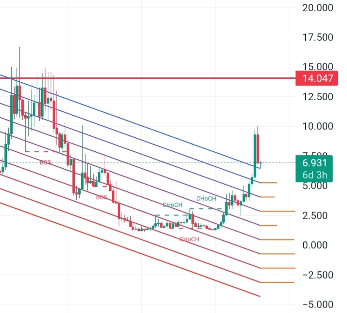 در بازه زمانی هفتگی کانال نزولی خودش رو شکسته و میبینید که پولبک هم به این کانال زده خوشبینانه بخوایم نگاه کنیم تا محدوده ۱۴ دلار در میان مدت و بلند مدت جای رشد داره البته در صورتی که سایکل بازار نزولی بشه این تحلیل باطل در تین صورت میشه حد ضرر رو محدوده ۶.۴۰ الی ۶ گذاشت