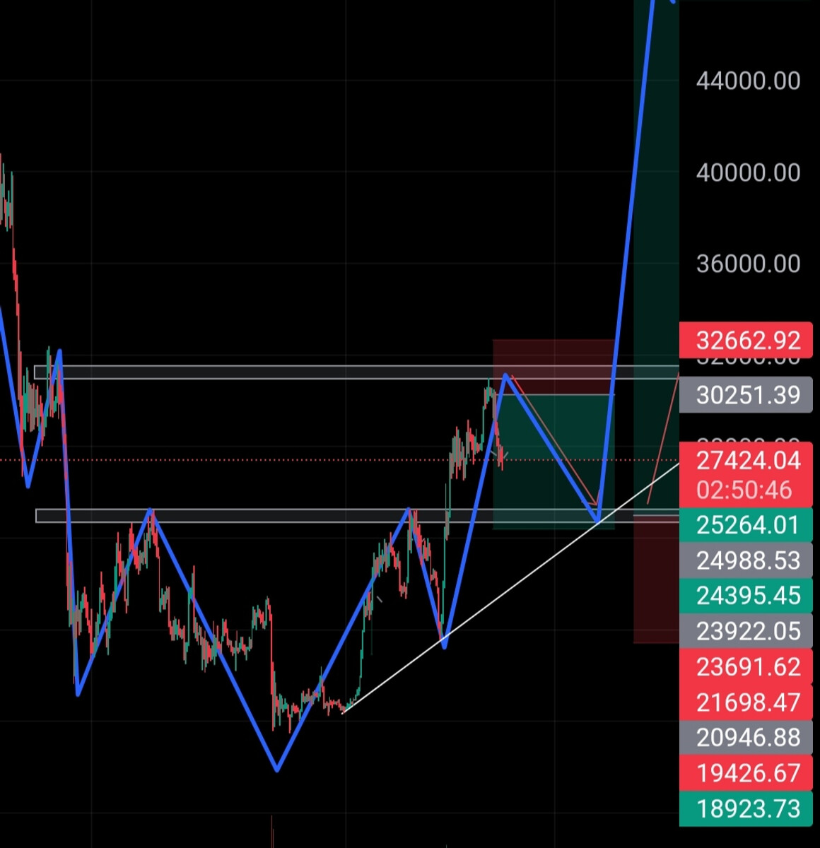 بازار در روند کلی صعودی است و در منطقه انباشت قرار دارید ولی طبق تحلیل های قبلی کاهش قیمت تا منطقه 25 هزار طبیعی است پیشنهاد میشود در شورت پوزیشن بمانید تا اصلاح کامل شود و طبق تحلیل قبلی بعد از کاهش قیمت و رسیدن به محدوده 25 هزار پله ای وارد پوزیشن لانگ شوید