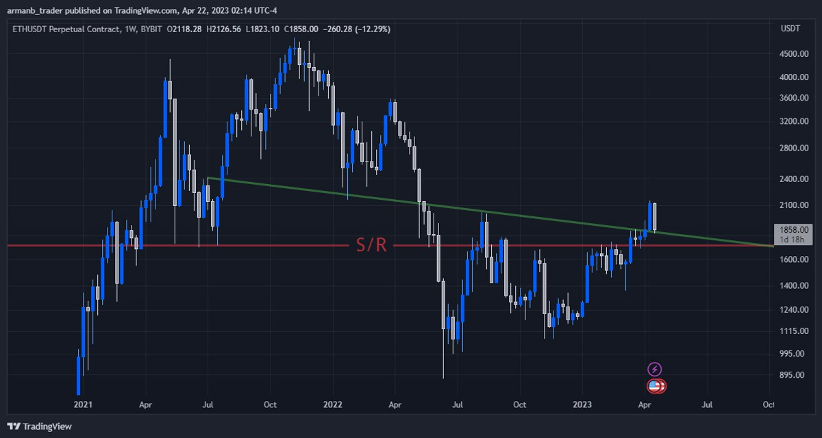 قیمت بعد از رشد خوبی که داشته باعث شکست مقاومت استاتیک خودش شده و در حال اصلاح نزولی میباشد و دو حمایت مهم استاتیک و دینامیک ( 1700$ ) دارد که میتواند باعث رشد مجدد قیمت از این سطوح شود.