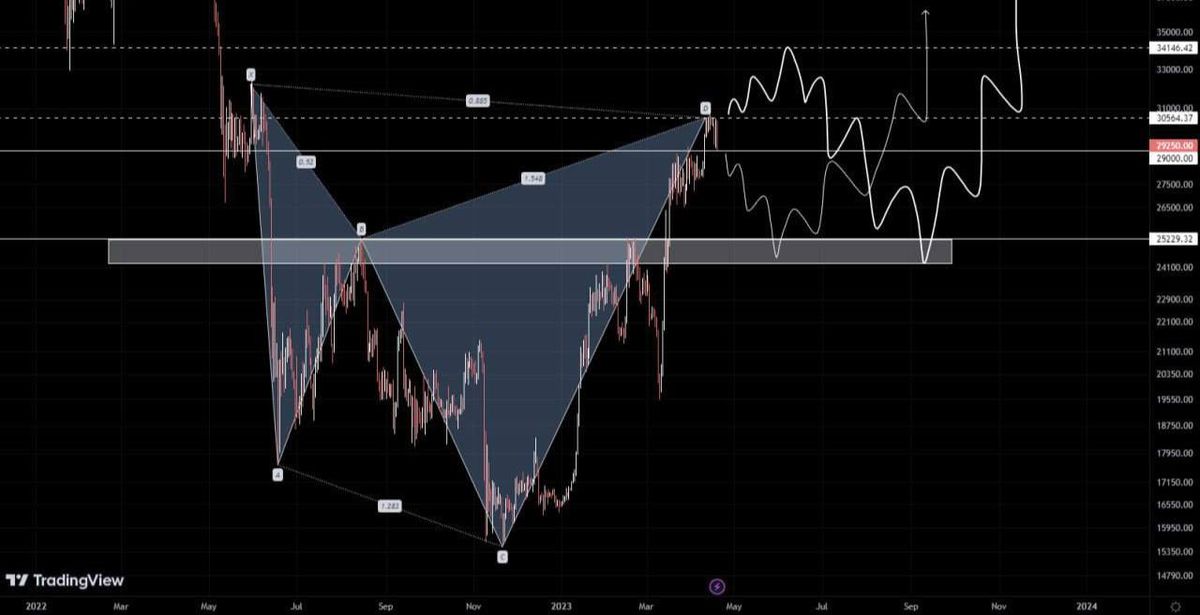 بیت کوین الگو برگشتی شارک پترن رو گرفته نواحی روی چارت مشخص هستش