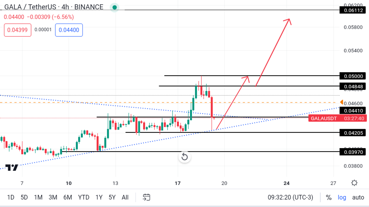 همبستگی گالا طی دو شب اخیر بر خلاف گذشته با بیت کوین کم شده و در دو شب اخیر عملکرد مناسبی داشته خروج از انزوای ماه اخیر یا به اصطلاح رها شدن فنر قیمت مشاهده شده و کاهش فعلی همگام با کلیت بازار صورت گرفته که حتی احتمال میرود امشب مجددا از منطقه حمایتی ریجکت کندل را با شادو بلند ببینیم و در ادامه ی مسیر رشد قیمت در اهداف مشخص شده در تصویر ثبت شدهسناریو دوم رنج در محدوده فعلی طی چند کندل ۴ساعته و مجددا حرکت به سمت اهداف ثبت شدهموفق باشید