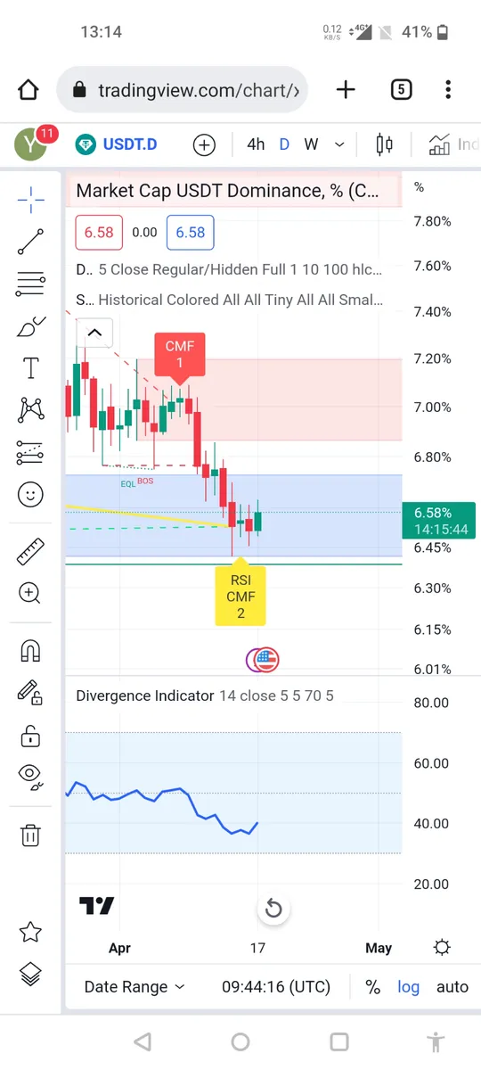 سلام دوستان سلطه تتر در محدوده حداقل به سمت بالا شروع به حرکت کرده با توجه به عرضه بیت کوین توسط نهنگها تا محدوده ۶.۹ درصد صعود میکند که این باعث اصلاح در آلت کوین ها خواهد شد