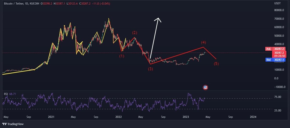 از سری موجهای اصلاحی و اخرین موج اصلاحیشه که در قالب الگوی ترمینال داره به پایان میرسونش ، با توجه به حرکت انتظار رشدی تا به ناحیه ۳۵_۳۶ هزار دلارو دارم و بعد از اون اصلاحی تا به حداکثر ناحیه ۲۵_26 هزار دلار. بعد از تکمیل این اصلاح ، حرکت شارپی بیت کوین در زمانی تقریباکمتر از یکسال تا به سقف ۵۰هزار دلار و بعد از اون متعاقب شکست تا به ۶۹ هزار دلار و ۱۰۰ هزار دلارو دارم ، البته پتانسیل حرکت باید در زمان حال بازار مدام بررسی و زیر نظر گرفته شود
