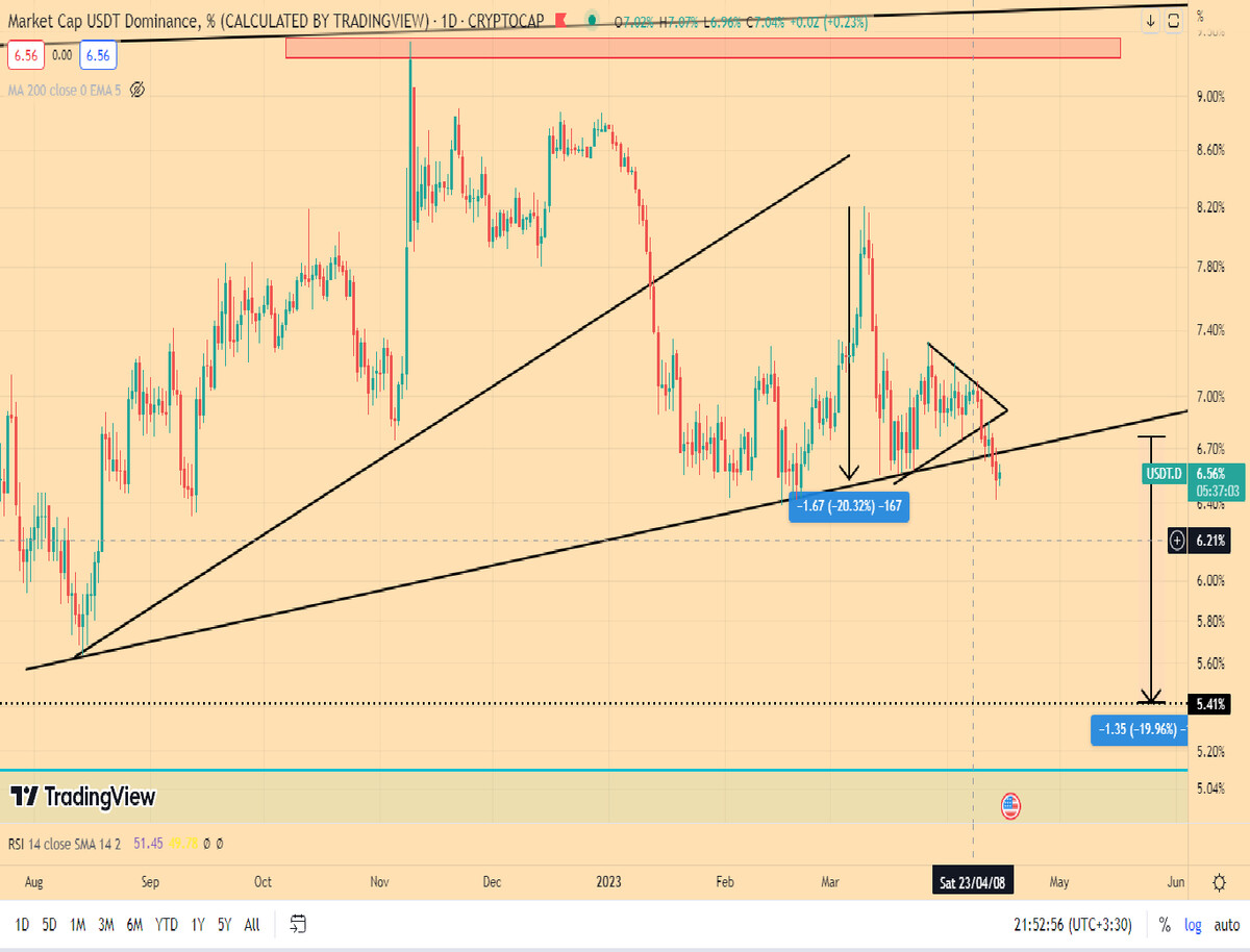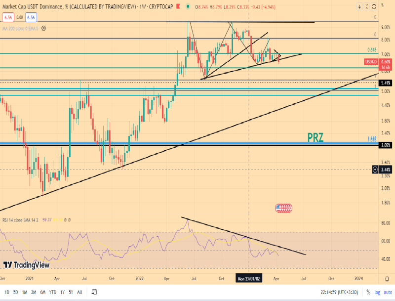 بسم الله الرحمن الرحیم.سلام و وقت بخیر.....تصویر پیوست نمودار روزانه دامیننس تتر میباشد که طی ایمپالس قوی از 9% به 6.5 ریزش داشته و طی ان حمایت کوتاه مدت داینامیک رو از دست داده در ادامه شاهد تولید کارکشن از محدوده 6.5 تا 8 و سپس از سر گیری موج جدید نزولی که در ناحیه 6.5 تا 7.5 به مدت حدود 1 ماه تولید فلگ صورت گرفته و طی کندل های روزهای اخیر ضلع پایین این پرچم و در ادامه حمایت داینامیک بلند مدت خودش رو از دست داده.شکست پرچم تایید شده است چرا که به میزان 5 درصد با ضلع ان اختلاف ایجاد شده و فاصله قیمتی وجود دارد پس نمیتوان به شکل یک شکست فیک به ان نگاه کرد.هدفی که این شاخص در کوتاه مدت دنبال خواهد کرد به نظر من ناحیه ی 5.5% و در ادامه چنانچه این حرکت مد نظر با مونتوم بالا انجام بشود به سمت ناحیه ی 4%(خط روند صعودی تایم هفتگی و میانگین 200) صورت خواهد گرفت. از طرفی وجود واگرایی منفی تایم هفتگی در ار اس ای و قرار گیری میانگین این اندیکاتور زیر ناحیه 50 گواه ادامه روند نزولی این شاخص میباشد. در تصویر زیر تصویر نمودار هفتگی این شاخص را مشاهده میکنید.