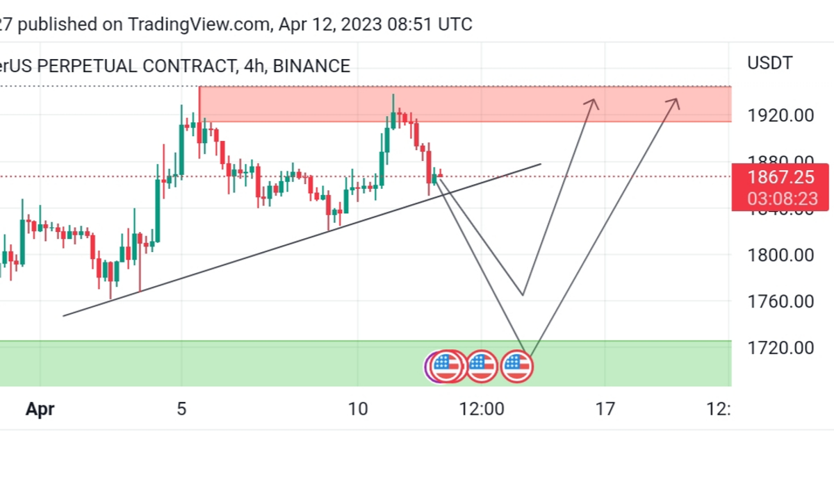 اتریوم در تایم ۴ ساعته زیر یک مقاومت استاتیک مهم در محدوده ۱۹۲۰ تا ۱۹۴۰ دلار قرار گرفته، با توجه به اینکه در همین تایم الگوی دابل تاپ تشکیل شده، در صورتی که زیر خط روند تثبیت بده احتمال اصلاح تا محدوده ۱۷۶۰ الی ۱۷۲۰ را خواهد داشت.
