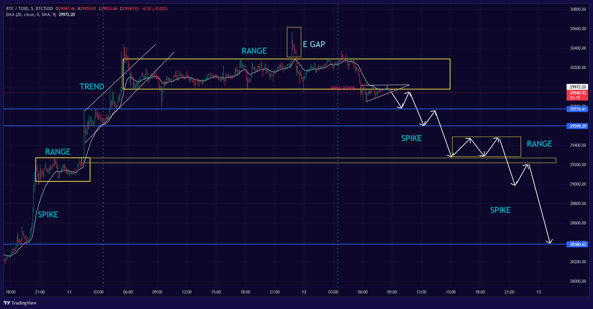 باتوجه به شکل گیری گپ فرسایشی در نمودار بیتکوین یا همون E GAP و شکسته شدن محدوده رنج و تشکیل الگوش مثلث ریزشی احتمال 40% اصلاح قیمت تا محدوده 28330 تارو داریم صرفا نظر شخصی می باشد